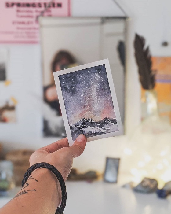 Sí, lo sé, dan ganas de echarse la tienda de campaña a la espalda, subir a esas montañas tras varias horas ascendiendo por estrechos senderos, y tumbarse en la cima a mirar las estrellas. Y lo más gracioso es que mientras Jara tiene infinitas pinturas como esta en su corazón, ella se permite el juego de decirme que, de cero a diez, su trabajo en marketing le gusta un dos.
